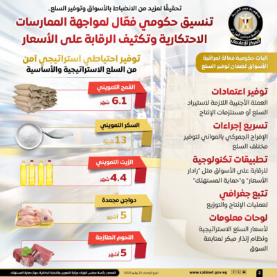 أعلن المركز الإعلامي لمجلس الوزراء عن جهود حكومية منسقة لتحقيق الانضباط في الأسواق وضمان توافر السلع الأساسية ومكافحة الممارسات الاحتكارية. وقد انعكس هذا التنسيق في تسجيل معدل التضخم العام في الحضر معدلات سالبة على أساس شهري في يونيو 2025 لأول مرة منذ بداية العام.