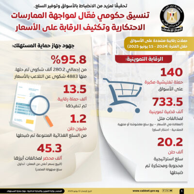 • جهاز حماية المستهلك: تم حل 95.8% من إجمالي 280.2 ألف شكوى، شملت 4883 شكوى تتعلق بالتلاعب بالأسعار. كما تم تنفيذ 13.5 ألف حملة رقابية وضبط 1.2 مليون طن من السلع الغذائية المخالفة.